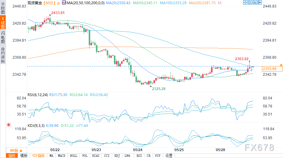 汇通财经APP讯——周二(5月28日)美盘时段,由于美元走弱且市场情绪出现负面变化,黄金收复早前跌幅,站上2350美元关口。