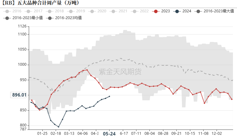 本周,五大品种合计产量为896.01万吨,环比上周上升6.49万吨(增幅0.7%),去年同期产量为926.49万吨,同比下降3.3%。
