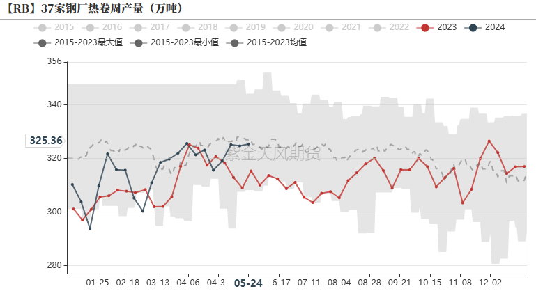 其中,螺纹产量共235.74万吨,环比上周上升2.16万吨(增幅0.9%),相较于去年同期下降12.8%。热卷产量为325.36万吨,环比上周上升0.7万吨(增幅0.2%),相较于去年同期上升3.19%。