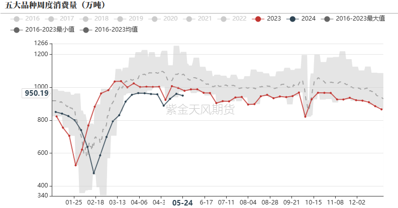 需求方面,本周五大品种消费总量达950.19万吨,环比下降10.88万吨,降幅1.1%,相比于去年同期下降3.0%。