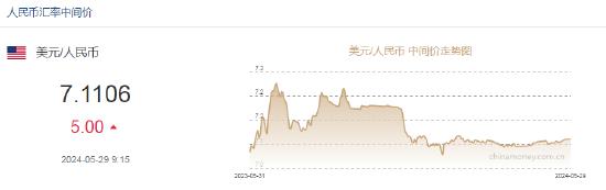 5月29日,人民币中间价报7.1106,下调5点,上一交易日中间价报7.1101。