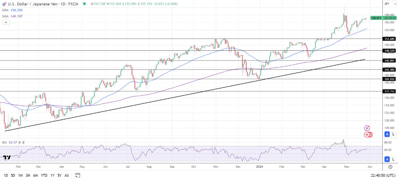14天RSI为62.07,表明美元/日元将回升至4月29日的高点160.209,然后进入超买区域。