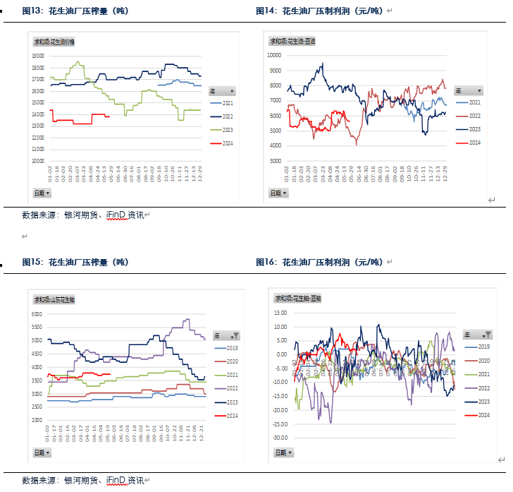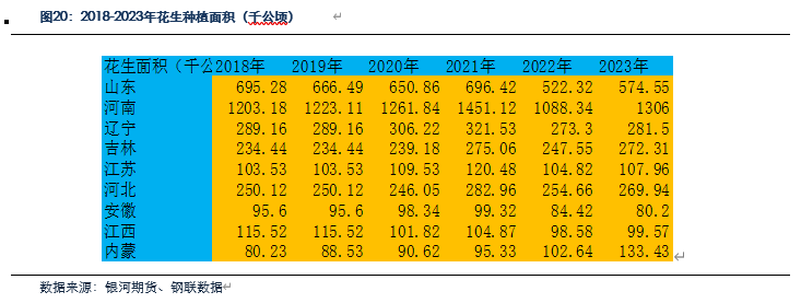 根据FAS数据,预计年全球花生消费5044万吨,其中中国消费1910万吨,印度消费608万吨。2023年全球花生产量5046万吨,中国产量1860万吨。中国花生1860万吨产量中,大约一半是食用,一半是榨油。2023年全球油脂第一大是棕榈,产量7946万吨,第二大是豆油,产量6168万吨,第三大是菜油,产量3379万吨,第四是葵花籽油,产量2166万吨,花生油产量614万吨。国内豆油消费1780万吨,菜油900万吨,棕榈605万吨,花生油326万吨,葵花籽油176万吨。花生油在国内消费比例较高,且花生油价格远高于其他主要油脂,花生的价格很大程度上取决于中粮、益海、鲁花等花生油厂的收购价格。第三部分国内花生基本面情况