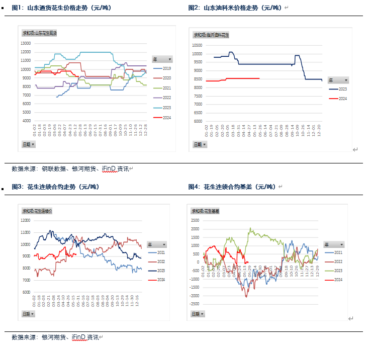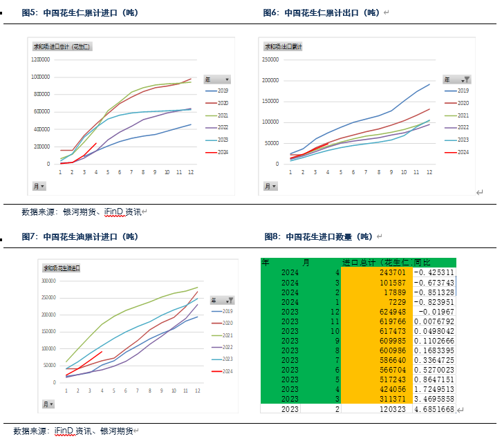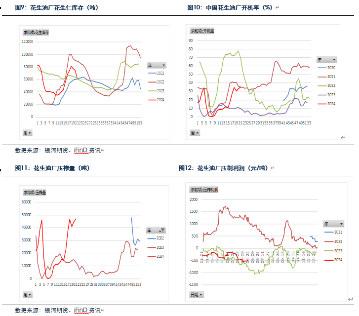 24年5月花生下游需求偏弱,花生产区通货米价格下跌至4.4元/斤附近,油厂油料米价格也在下跌。进口花生米环比增加较多,但仍远低于去年同期,进口苏丹米和塞内加尔米价格也在回落。5月底河南产区花生开始种植,预计面积会增加较多,贸易商库存也高于去年。花生油厂花生仁库存较高,开机率上涨,花生油库存也持续增加。但6月仍会炒作天气,通货花生仍有小幅反弹,10期货仍有炒作可能,但今年面积大概率会增加,新季花生会下跌,10花生上方反弹空间有限。