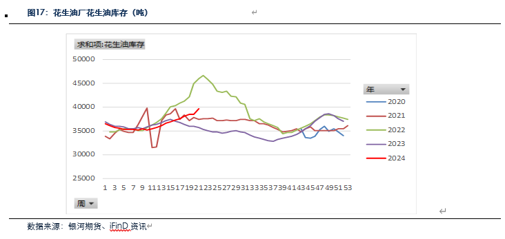 花生油厂花生仁库存高位回落,开机率也持续上升。截止5月24日,国内花生油样本企业厂家花生仁库存6.3万吨,库存高位回落。花生油开机率35.1%,开机率继续上升。由于油厂收购价格下跌,但花生油和花生粕价格回落,花生油加工利润稳定,截止5月23日,花生油利润为-431元/吨,略高于上月同期的--447元/吨。花生油厂利润亏损,油厂会下调收购价格。5月益海、中粮、鲁花等大型油厂持续下调收购价格,基本在8100-8800元/吨,低于上月的8500-9200元/吨。