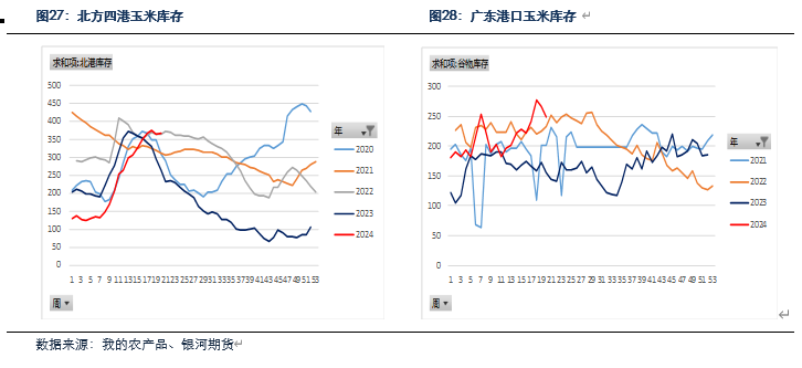 2024年5月南北方港口库存继续上升。根据Mysteel玉米团队数据显示,5月17日北方四港玉米库存共计366.6万吨,上涨到过去4年高位。广东港内贸玉米库存69.4万吨,外贸库存42.5万吨,进口高粱46.3万吨,进口大麦89.7万吨,累计谷物库存247.9万吨。