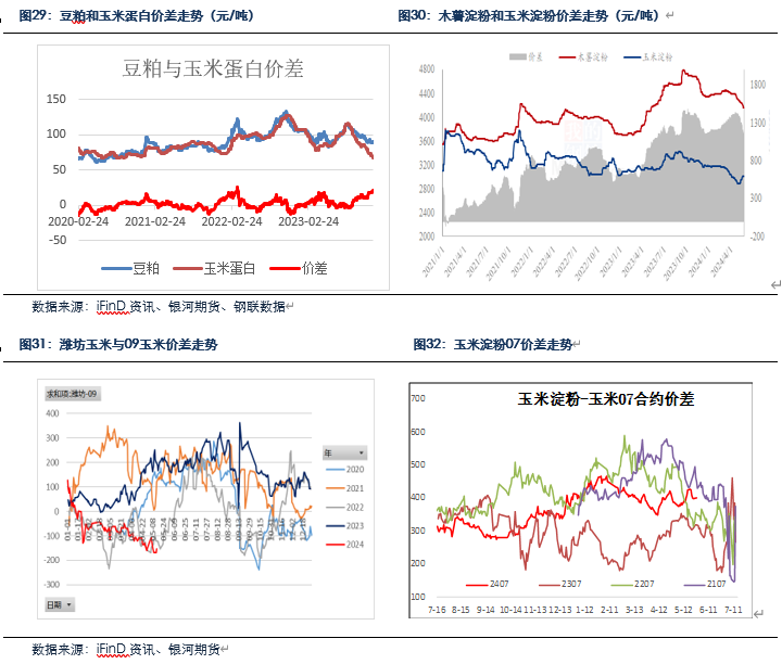 2024年5月东北玉米偏强,东北与华北玉米价差较低,最低淀粉仓单在山东。由于东北受中储粮政策及深加工库存偏低影响,玉米现货相对偏强,但山东地区上量较多,深加工库存较高,且小麦开始上市,部分山东玉米价格和黑龙江价格持平,淀粉与港口玉米价差也在缩小。07淀粉仍升水,仓单较多,且7月注销合约,预计6月底,07玉米和淀粉价差会回归缩小。由于7月山东玉米价格仍会上涨,东北与华北玉米价差大概率会走扩,且9月淀粉是旺季合约,7-9淀粉价差大概率会走反套,预计低点可能在-100左右。