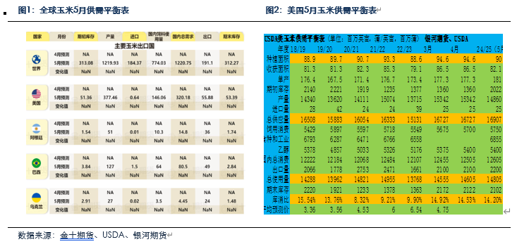 5月开始,市场交易重点转向美玉米,美玉米底部抬升,6月仍会炒作天气。5月USDA报告美玉米产量3.77亿吨,出口预计5588万吨,期末库存预计0.53亿吨。且美小麦与美玉米的价差达到230美分/蒲的高位,带动美玉米价格上移。对于其他主要出口国,巴西产量预计1.27亿吨,出口0.49亿吨,阿根廷产量预计0.51亿吨,出口0.36亿吨,乌克兰产量预计0.27亿吨,出口0.24亿吨,全球供应仍充足。