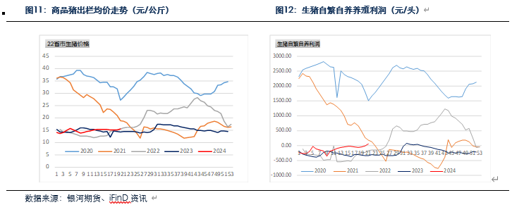 根据中国饲料工业协会数据,2024年4饲料产量2423万吨,环比下降1.5%,同比下降7.9%,玉米用量占比36.5%,同比下降2.2%。2024年4月养殖行业延续弱势,生猪存栏继续去化,生猪利润继续增加,肉禽和蛋禽利润仍较弱。根据钢联数据,123家样本企业能繁母猪4月存栏485.76万头,环比涨0.87%,同比减少4.59%。商品猪4月存栏3338.49万头,环比上涨0.14%,同比下降1.35%。截止5月25日,自繁自养利润为191元/头,外购仔猪利润315元/头。白羽肉鸡由于下游鸡产品走货偏慢,但价格也在下跌,养殖利润也在下降。截止4月25日,鸡蛋养殖成本3.66元/斤,养殖利润-0.47元/斤,白羽肉鸡养殖利润0.22元/只。