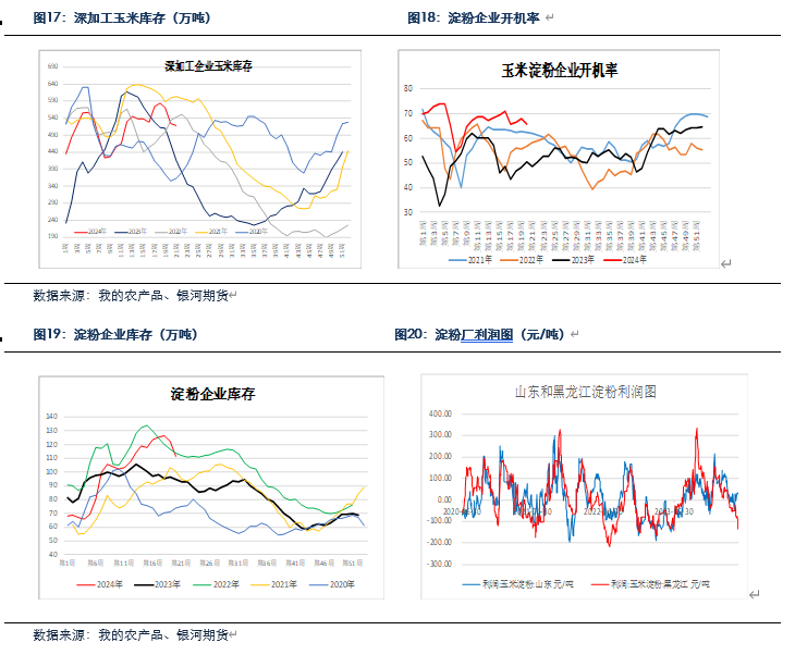 2024年5月开机率增加,但下游提货量大幅增加,淀粉库存下降较多,淀粉厂利润继续下滑。截止5月24日,淀粉企业开机率65.5%,仍处于高位,深加工玉米库存为518.4万吨,同比去年增加24.98%,但黑龙江玉米库存136.1万吨,低于去年的18.16%,山东玉米库存116.7万吨,高于去年157%。截止5月23日全国淀粉企业淀粉库存为104万吨,月增幅17.2%,年同比增幅9.8%。下游F55果葡糖浆开机率45.9%,麦芽糖47.1%,瓦楞纸开机率63%,箱板纸开机率62.4%。由于今年开机率较高,玉米价格上涨较多,淀粉企业利润也在下滑。截止5月27日,黑龙江淀粉利润为-110元/吨,山东利润26元/吨。目前由于山东玉米与黑龙江玉米价差较低,山东淀粉企业利润较好,但黑龙江利润持续恶化。
