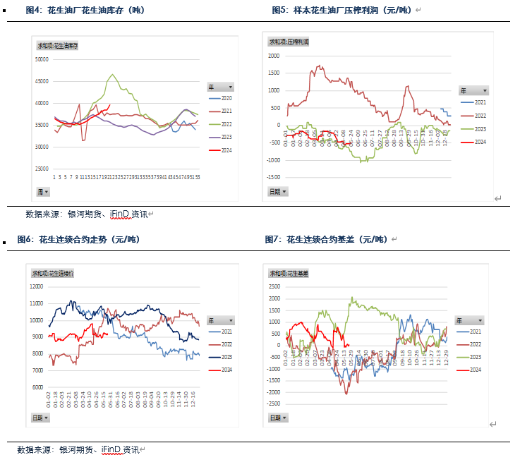 截止到5月底,贸易商库存仍较高,下游食品消费较差,且花生油厂花生油库存处于高位,油厂压制利润亏损扩大。根据钢联数据,截止5月24日,花生油样本企业厂家库存为3.96万吨,高于去年,且花生油库存仍在增加。花生油厂榨利为-431元/吨,花生油厂持续下调收购价格。对于花生食品企业,据我们调研,两广地区消费远低于去年,通货花生价格年后持续下跌,贸易商被动入库,且入库成本大部分在10400元/吨以上。