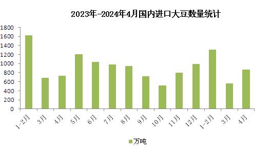供应面:2024年1-4月大豆进口总量2714.8万吨,同比去年减少79.7万吨。4月份我国大豆进口量857.2万吨,比3月份的554万吨增长54.69%,比去年同期增加18.04%。5月以来,进口大豆到港量不断增加,进口量预计将达1000万吨。供应面压力仍在,限制豆粕行情上涨空间。