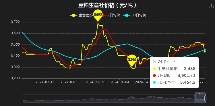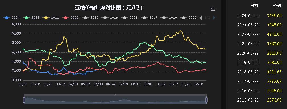根据生意社豆粕价格年度对比图可以看出,2024年1-2月,豆粕行情持续下跌,跌幅超16%。3月开始迎来上涨行情,振荡上涨超半个月之后,豆粕行情继续下跌一直跌至4月中旬,4月14日豆粕价格处于2024年内最低点,跌至2020年同期水平。4月15日开始,豆粕行情迎来短暂反弹,上涨过后,继续弱势振荡为主,价格持续3300元/吨左右。五一过后,豆粕行情迎来反弹,涨幅超4%,市场均价突破3400元大关,大涨过后高位振荡,月底涨至3500元/吨之后,又回调。5月29日,豆粕市场均价3438元/吨,依然处于四年内低位。
