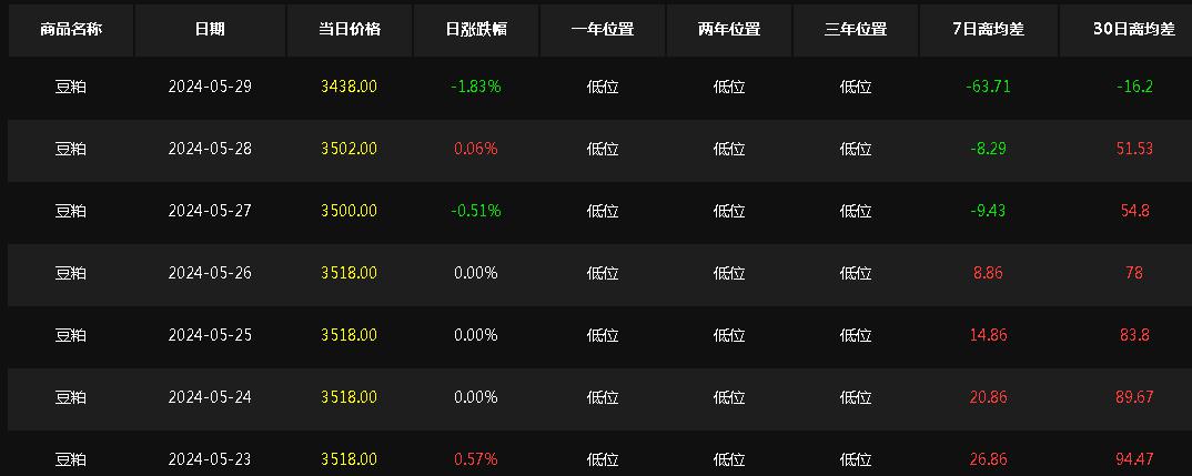 技术面:豆粕行情处于历史低位,仍有下行趋势。