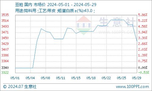 据生意社商品行情分析系统显示:5月豆粕行情摆脱颓势,迎来涨情,行情不断走高,由于利空仍在,月底迎来回调,整体振荡上涨为主。5月1日,豆粕市场均价3340元/吨,5月29日,豆粕市场均价3502元/吨,价格上涨2.93%。