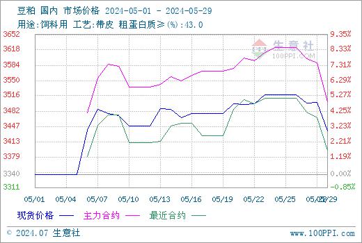 期货:五一假期,外盘豆类期货走高,节日过后,国内豆粕期货行情迎来一波补涨,5月6日,连豆粕主力合约收3475元/吨,上涨91元/吨。中旬,由于暴雨天气不断,洪灾影响,巴西大豆产量预估至1.545亿吨,下调200万吨左右。外盘豆类行情支撑,国内豆粕期货振荡走高。月底,利多因素被市场消化,豆粕期货陆续回调。整个5月,豆粕期现走势相近,期货行情支撑豆粕行情振荡上行。