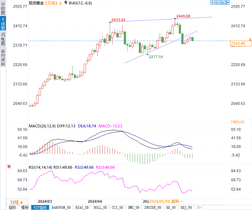 移动平均线:金价的短期支撑位于50日移动均线2323美元/盎司。若金价跌破此水平,可能进一步下探至2300美元/盎司的心理关口。