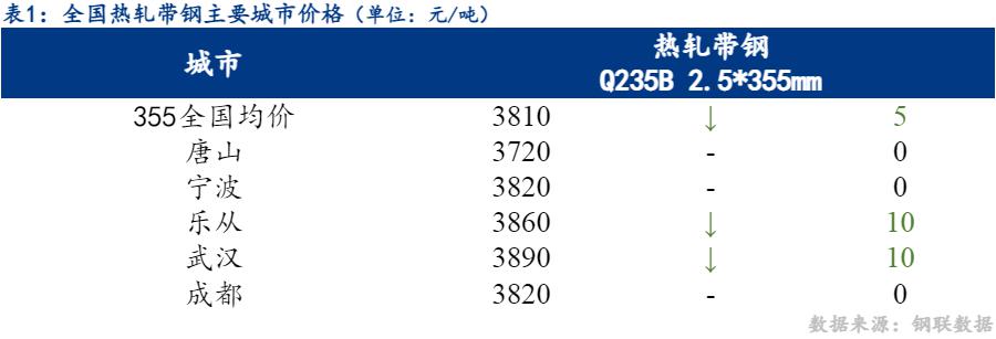 29日热轧带钢全国主要城市价格稳中个降,截至发稿时2.5*355mm热轧带钢均价3810元/吨,较昨下降5元/吨,其中2.5*355mm主要城市报价为唐山3720元/吨,宁波3820元/吨,乐从3860元/吨。