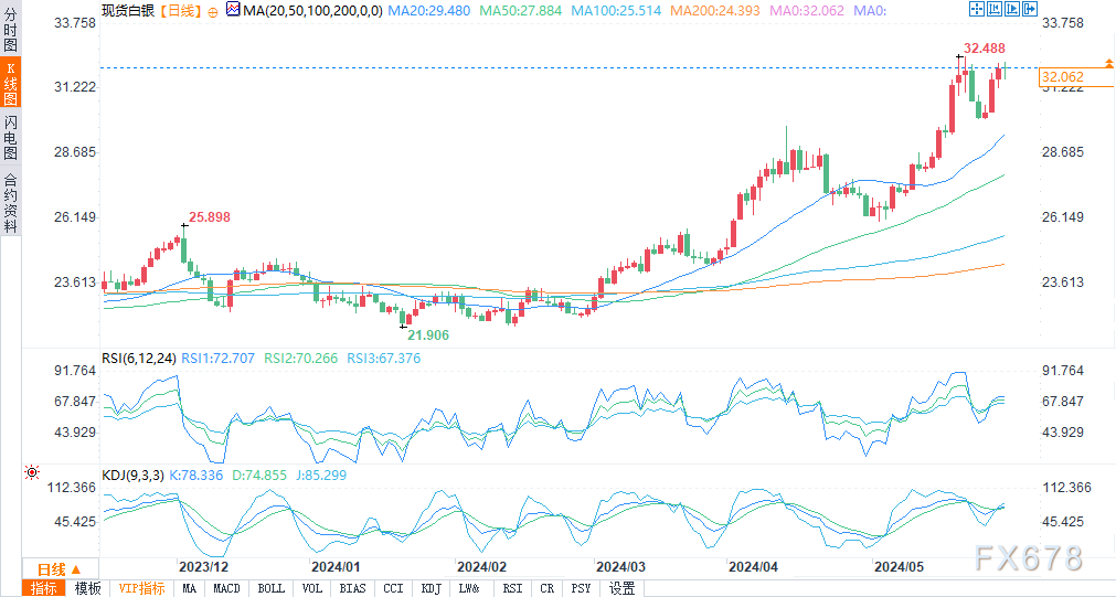 银价周二大幅上涨,挑战了最近11年来的高点。金尼斯(Kinesis)的弗兰克·沃森(Frank Watson)表示:“白银作为贵金属和工业金属的双重角色意味着,它也受益于当前经济增长相当强劲和通胀高企的环境,这推动了贵金属作为对冲成本上升的工具,同时市场预期今年晚些时候将降息,这将降低持有无息资产的机会成本。”