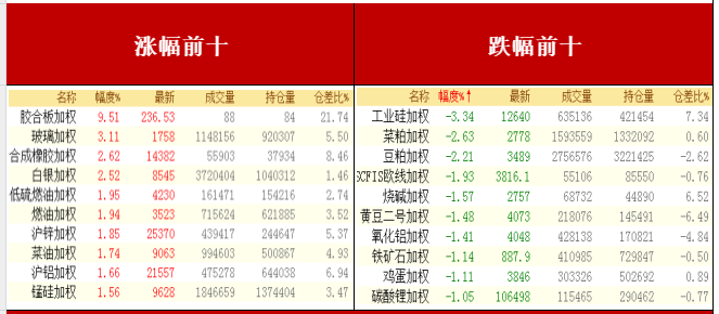 5月29日,国内商品期市收盘涨跌不一,胶合板主力合约涨停;能化品多数上涨,受房地产调控政策优化影响,玻璃产销受到明显提振,企业库存小幅波动,玻璃涨逾3%,丁二烯橡胶、低硫燃料油涨逾2%;