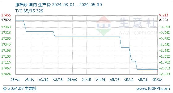5月30日,生意社涤棉纱基准价为17060.00元/吨,与本月初(17300.00元/吨)相比,下降了-1.39%。