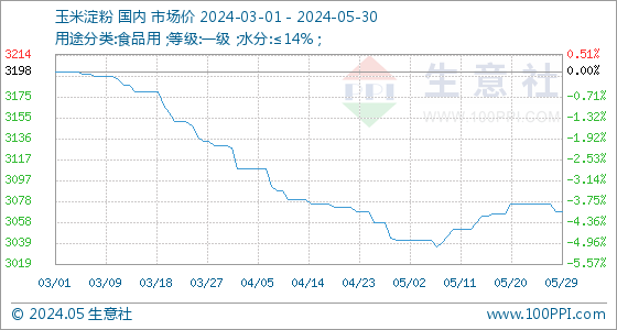5月30日生意社玉米淀粉基准价为3068.00元/吨