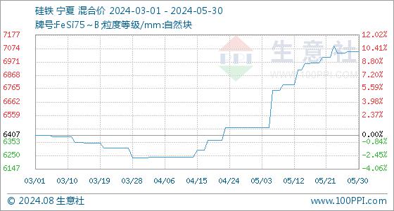 5月30日,生意社硅铁基准价为7050.00元/吨,与本月初(6464.29元/吨)相比,上涨了9.06%。