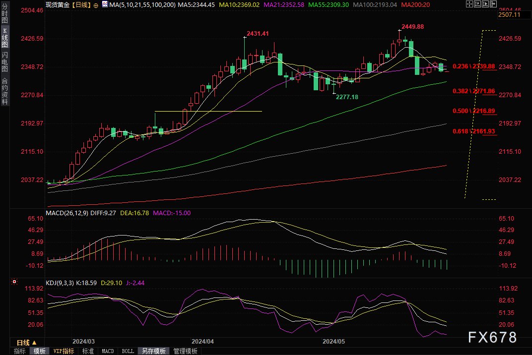 汇通财经APP讯——周四(5月30日)亚市早盘,现货黄金窄幅震荡,目前交投于2338.64美元/盎司附近。金价周三下跌近1%,收报2337.88美元/盎司,美元走强至两周高位、美国国债收益率上升至四周高位和美联储官员的鹰派发言打击市场情绪。市场焦点转向本周稍晚将公布美国通胀数据,技术面来看,金价后市面临下探2300关口的风险。