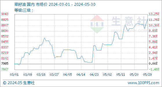 5月30日生意社菜籽油基准价为8945.00元/吨