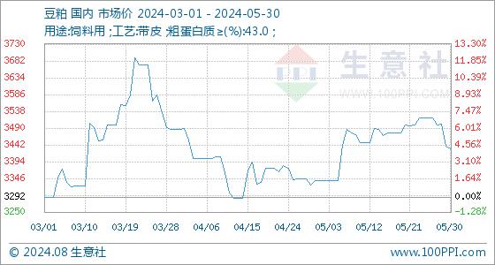 5月30日,生意社豆粕基准价为3438.00元/吨,与本月初(3340.00元/吨)相比,上涨了2.93%。