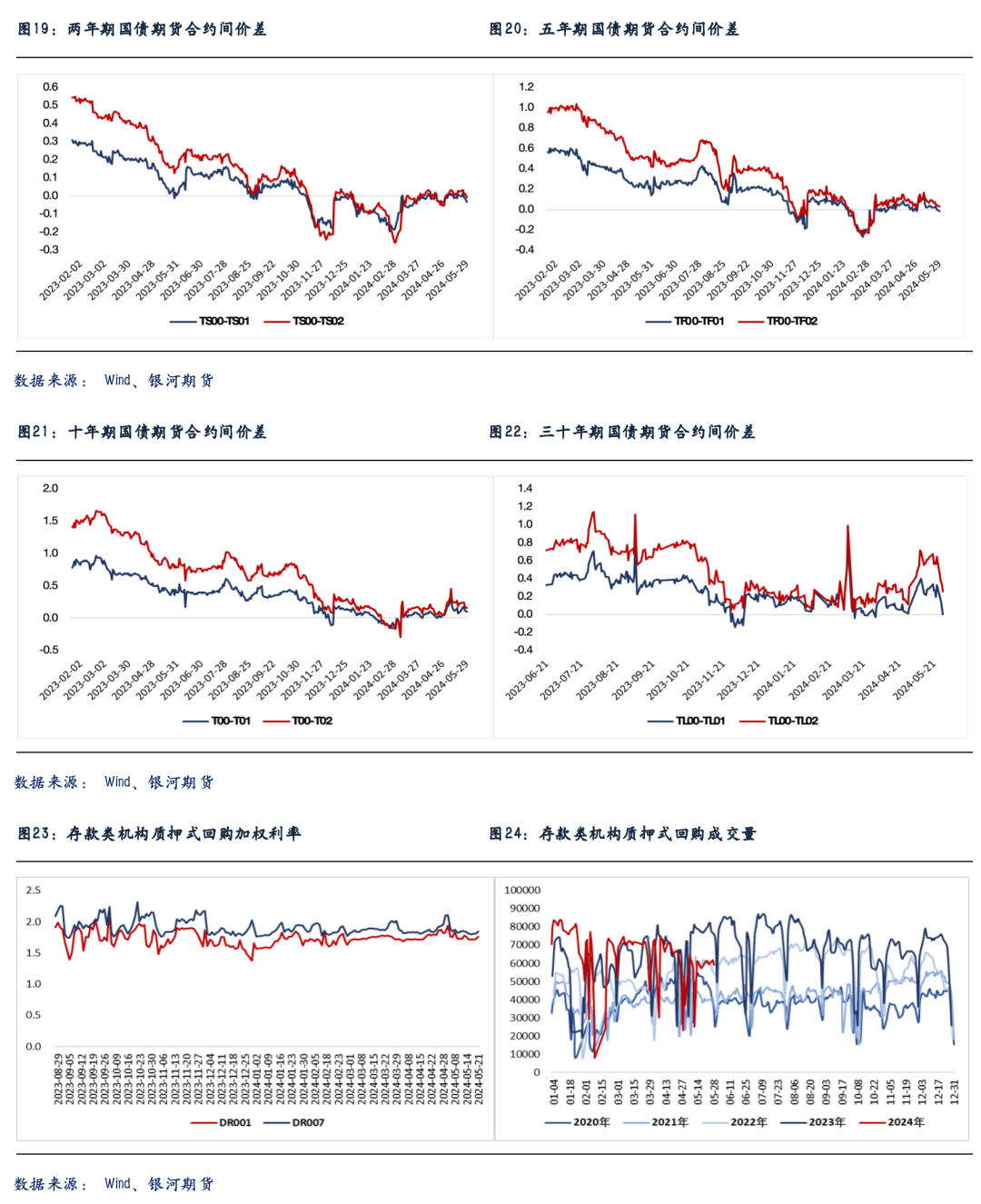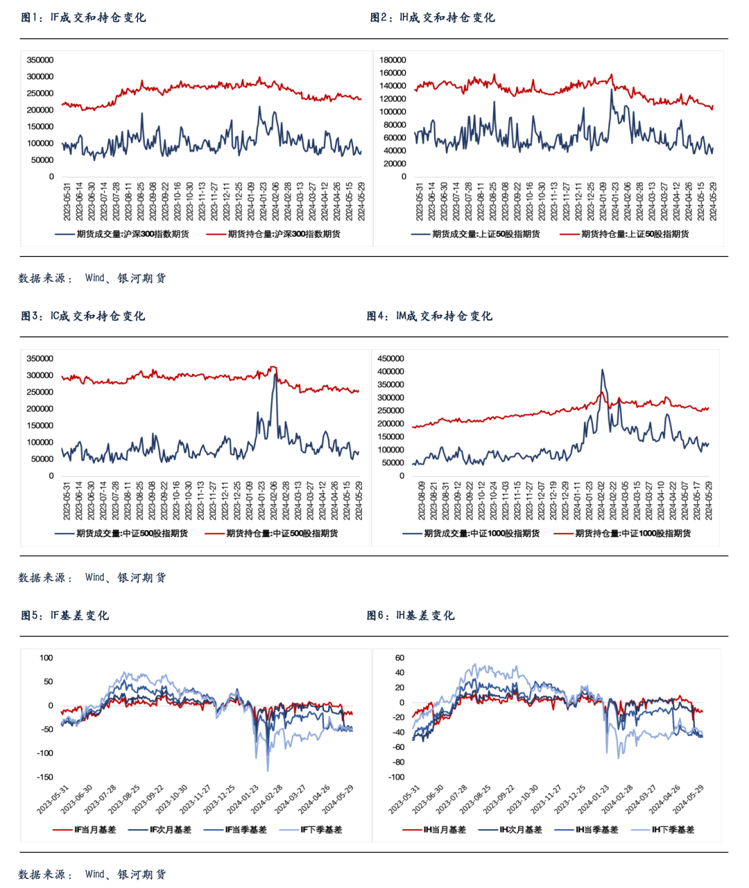 股指期货随现货回落,至收盘,主力成交合约IH2406涨0.1%,IF2406涨0.09%,IC2406涨0.33%,IM2406涨0.16%。除IM当月合约外,各品种基差小幅下行,贴水略有扩大。IC、IF、IH和IM成交分别增加12.5%、11.1%、22.4%和8.7%。IC、IF、IH和IM持仓分别增加1.5%、0.9%、5.5%和4%。
