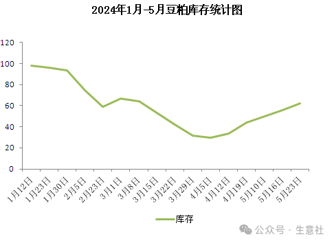 库存:从生意社豆粕库存统计图可以看出,2024年1-4月豆粕库存量不断下滑,4月5日当周豆粕库存处于年内最低点,仅有30万吨。4月中旬开始,豆粕库存量呈现反弹之势,不断增加。4月19日当周,豆粕库存已经超44万吨。5月开始,豆粕不断累库,库存量不断走高。截止5月23日当周,豆粕库存已经高达60万吨一线,较最低点增加了一倍。随着库存量的不断增加,豆粕行情承压。