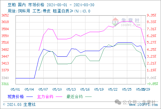 据生意社商品行情分析系统,5月初豆粕行情摆脱颓势,迎来涨情,但是由于利空仍在,月底回吐部分涨幅,整体震荡上涨为主。5月1日,豆粕市场均价3340元/吨,5月29日,豆粕市场均价3438元/吨,价格上涨2.93%。