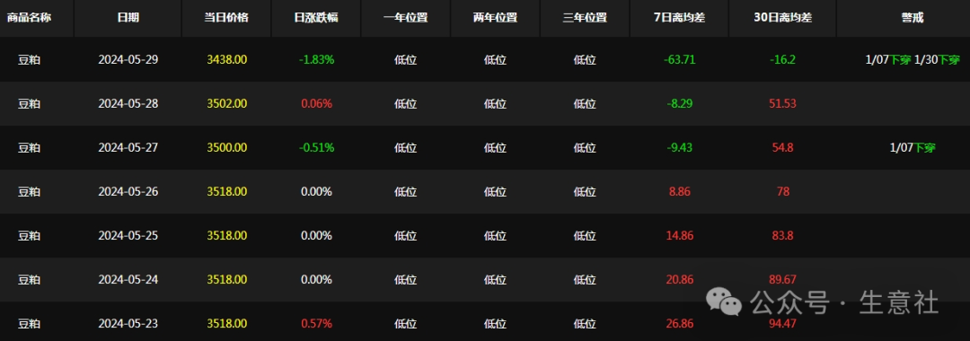 据生意社商品行情分析系统,5月开始,7日均线上穿30日均线启动上行态势,但当前两条均线有相向而行的趋势,且豆粕生意社价格均线下穿7日均线与30日均线。