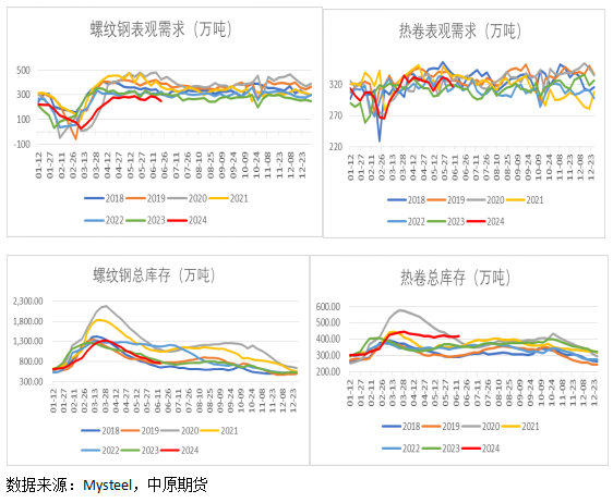 从钢材供需基本面来看,当前随着淡季需求下滑压力逐步显现,钢材去库进一步收窄。其中,螺纹钢周度产增需减,产量较上周增加3.73万吨,表需大幅下降28.27万吨,目前供需仍呈现双弱的格局,库存降幅继续趋缓,较上周下降10.43万吨至773.67万吨,其中厂库下降0.47万吨至202.38万吨,较2023年同期下降10%,社库下降9.96万吨至571.29万吨,较2023年下降2%。热卷方面,本周产需双双回落,产量下降2.7万吨,表需下降11.25万吨,供需绝对值仍处于历史同期中位水平。但库存由降转增,总库存较上周增加6.07万吨,社库增加3.37万吨,高出2023年同期23%,厂库偏低,环比增加2.7万吨至87.8万吨,较2023年同期略增0.7%。基于需求回落,当前热卷社库压力偏高,关注后续制造业补库情况。螺纹钢库存压力并未显现,但需留意6月之后供需结构的变化,累库拐点或将在6月中旬到来。