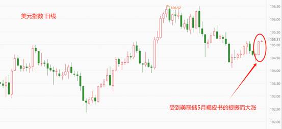 受到褐皮书鹰派表态的影响,昨日,美元指数大涨0.48%,最高触及105.15,创出5月15日以来新高。本周一收出小阴线,本周二收出长下映的十字星,本周三以长阳线收盘,短期行情走势呈现出标准的触底反弹特征。5月16日形成本月最低点,当时报价为104.08点,按照今日盘中价格105.11计算,累计涨幅已经达到0.99%。从近两月的走势结构看,美元指数的高点依旧在不断降低,低点不断刷新纪录,空头趋势尚未终结。自5月16日至今的反弹走势能否演变为反转,取决于降低预期是否还会卷土重来。