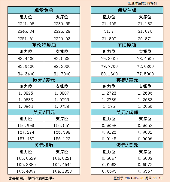 汇通财经APP讯——本文提供黄金、白银、原油、美元指数、欧元、英镑、日元、瑞郎、澳元支撑阻力位。