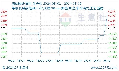 据生意社商品行情分析系统,5月国内涤纶短纤主流市场价格呈现先跌后涨态势,截止5月30日1.4D*38mm短纤工厂均价在7682元/吨,较月初上涨0.39%。