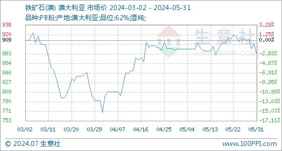 5月31日,生意社铁矿石(澳)基准价为902.56元/吨,与本月初(892.11元/吨)相比,上涨了1.17%。