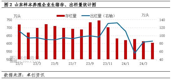 2023年四季度猪病影响能繁母猪及中小体重生猪存栏受损,山东地区受损幅度较其他地区更为明显。2023年11-12月份,养殖企业加速出栏中小体重生猪,据卓创资讯监测数据显示,山东地区代表规模养殖企业12月生猪出栏量达到132.31万头,较10月增幅36.43%。随着中小体重生猪提前出栏,2月份开始,标猪出栏有所断档,叠加春节假期影响,2月份山东样本企业生猪出栏量环比降幅50.01%。3-4月份山东样本企业生猪出栏量虽有恢复,但仍较春节前出栏高峰期下降36.00%左右。5月初卓创资讯调研山东代表养殖企业5月生猪出栏计划环比减少4.69%,规模养殖场生猪出栏较春节前显著缩减。
