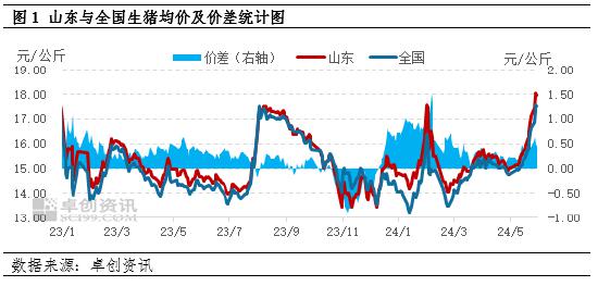 据卓创资讯监测数据显示,山东与全国生猪价差由5月6日的0.23元/公斤最高增至28日的0.64元/公斤,截至30日,5月份山东与全国生猪价差平均为0.39元/公斤,环比上月扩大0.15元/公斤。因2023年四季度猪病影响,北方地区生猪存栏受损,导致2024年春季过后北方地区生猪供应出现缺口,尤其5月份山东地区标猪供应断档,屠宰企业收购不畅,支撑猪价上涨。