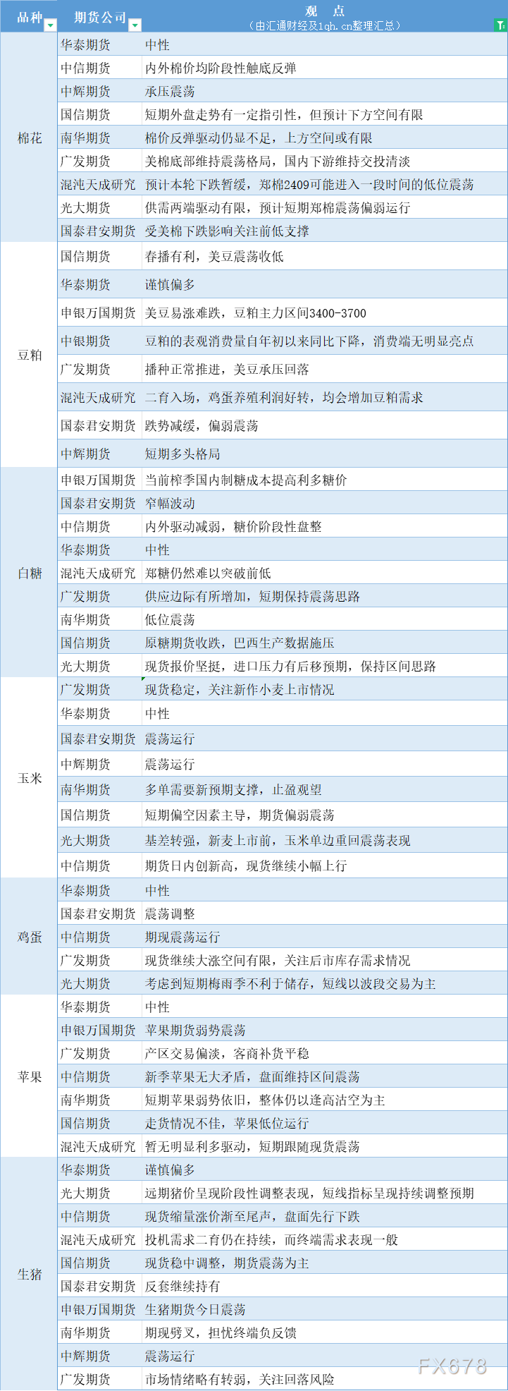汇通财经APP讯——期货公司观点汇总一张图:5月31日农产品(棉花、豆粕、白糖、玉米、鸡蛋、生猪等)