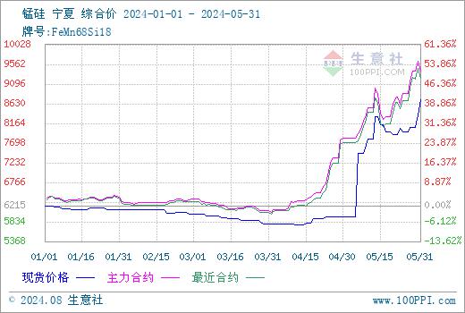 2024年硅铁开年以来,市场弱势下行,1-4月现货价格及钢招价格延续下跌。据生意社商品行情分析系统,硅铁(牌号:FeSi75~B;粒度等级/mm:自然块)宁夏地区3月跌至年内低点,市场均价6233元/吨,5月末至年内高点,市场均价7714元/吨,涨1481元/吨左右,涨幅23.77%。