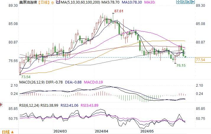 北京时间5月31日11:40美原油连续报77.56美元/桶