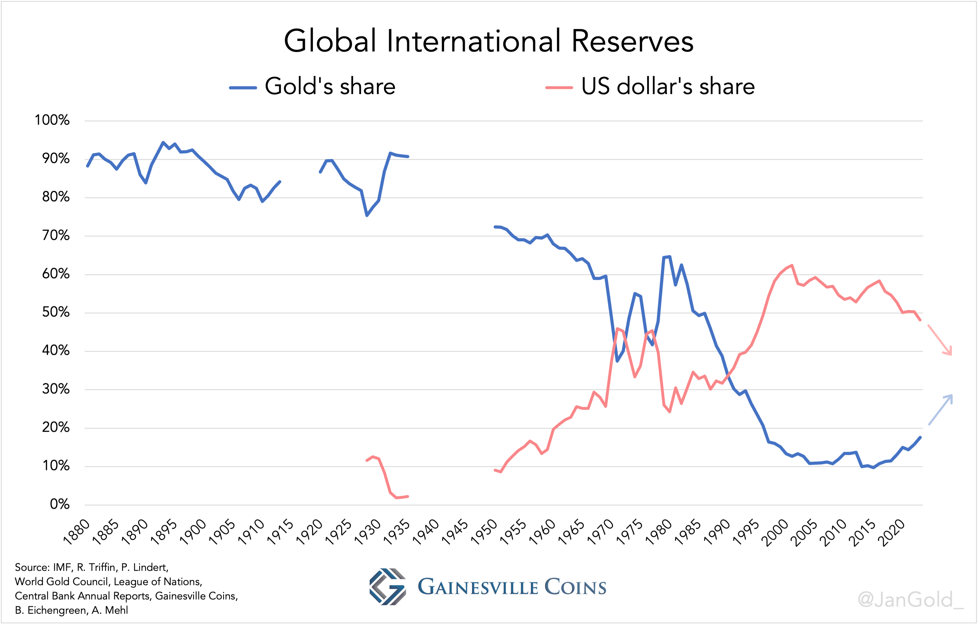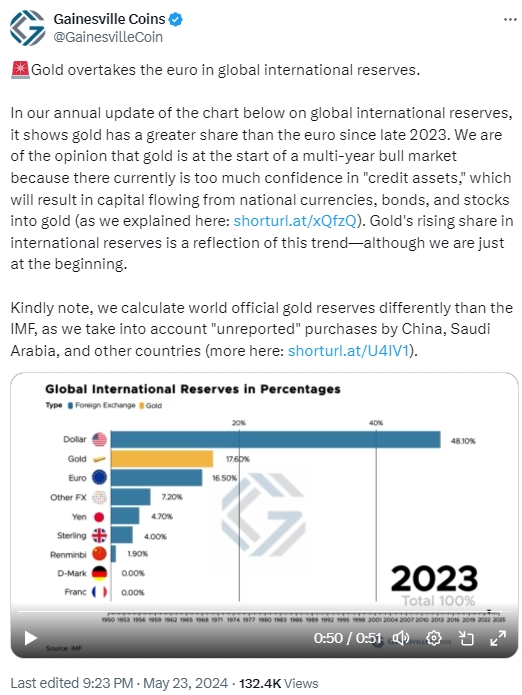 Gainesville Coins黄金分析师Jan Nieuwenhuijs表示,自2009年以来,央行大力购买黄金,金价不断上涨,导致贵金属在全球国际储备中的份额不断增加,对法定货币造成不利影响。到2023年底,黄金全球储备超过欧元,下一个受到挑战的法定货币是美元。