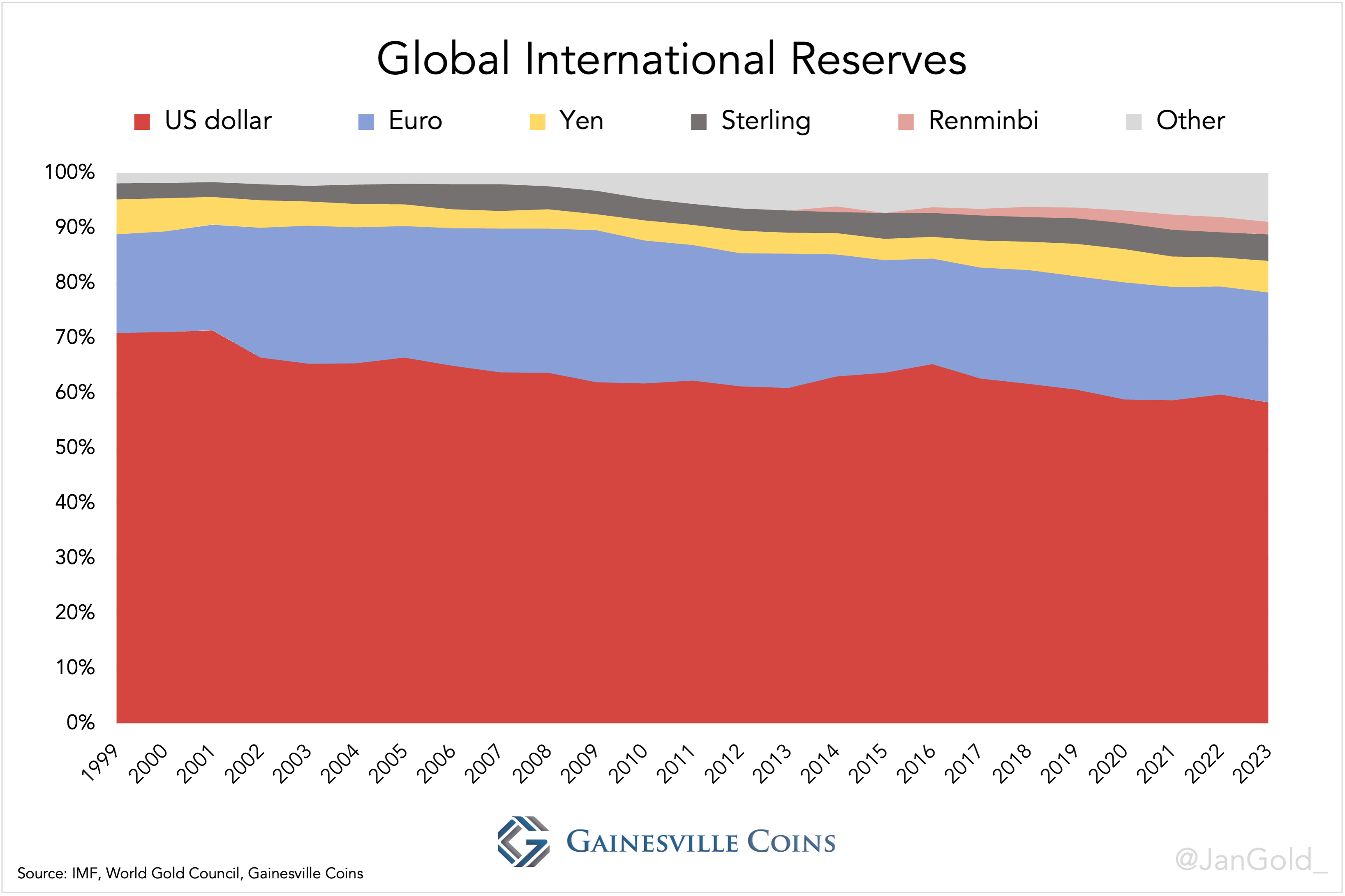 根据这样的图表,美元在总储备中的份额似乎正在缓慢下降,从2001年的72%的峰值下降到2023年的58%。