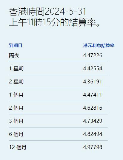 一星期拆息升至4.42554%,反映银行资金成本的三个月拆息跌至4.73429%。六个月及一年期分别升至4.82494%及4.97798%。