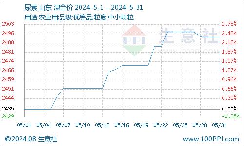 本月国内尿素价格震荡上涨。5月1日尿素价格在2435元/吨,5月31日尿素价格在2493元/吨,价格较月初上涨2.36%。