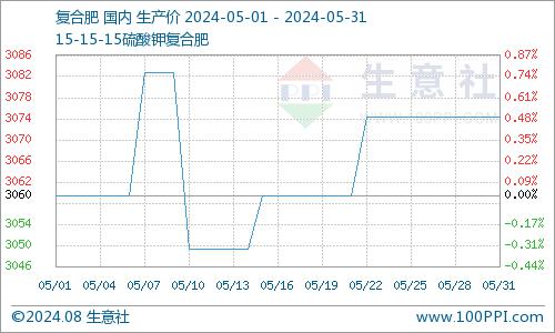 据生意社商品行情分析系统,截止5月31日复合肥市场均价在3075元/吨,5月1日复合肥市场均价在3060元/吨,价格较上月初上涨0.46%。