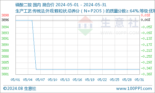据生意社商品行情分析系统,5月1日国内64%二铵市场均价是3896元/吨,5月31日国内64%二铵市场均价是3883元/吨,本月磷酸二铵市场价格下跌0.34%。